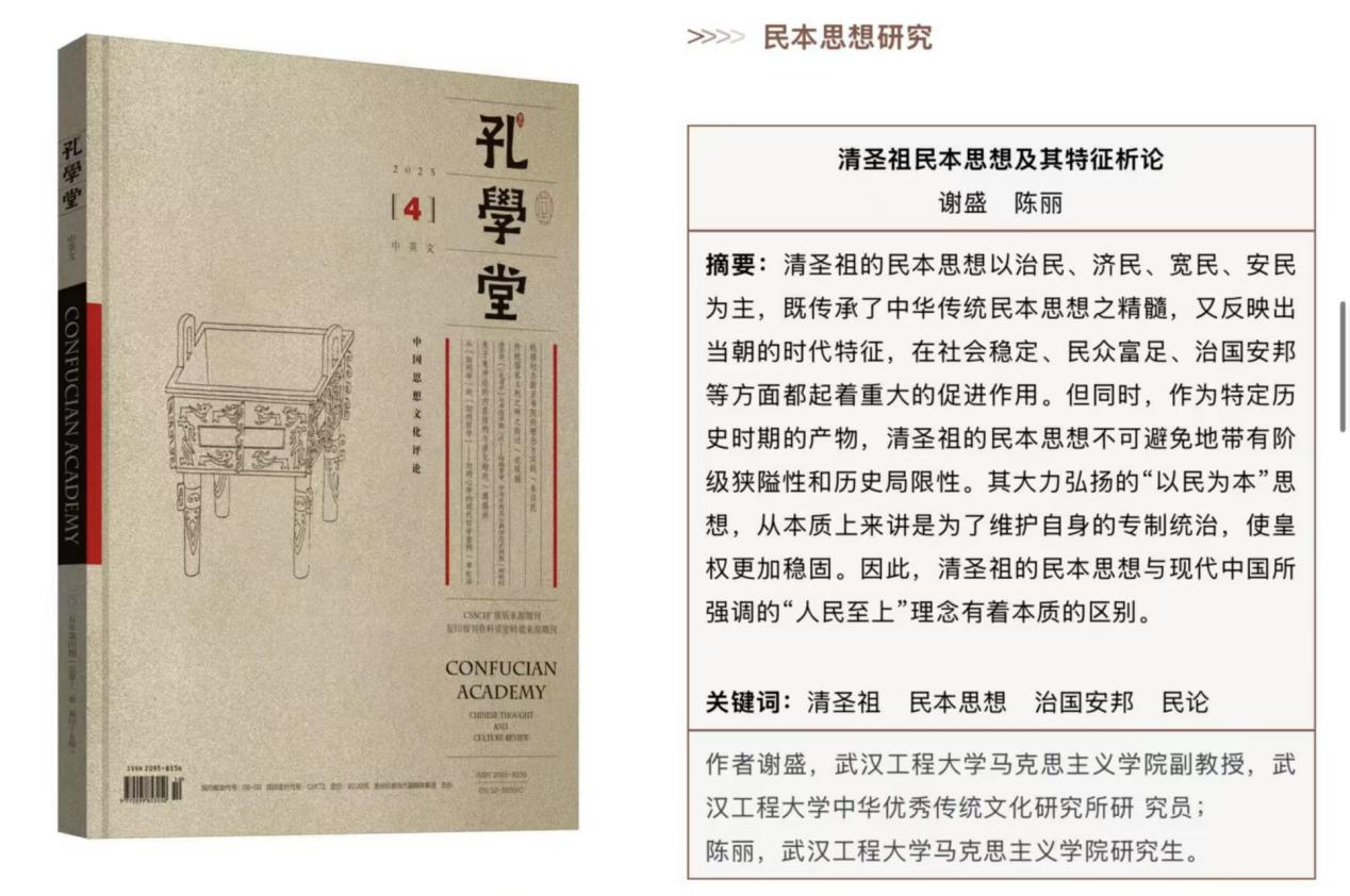 本网讯(通讯员 张晓 宋嘉怡)近日,公司谢盛副教授、硕士研究生陈丽在《孔学堂》(CSSCI扩展版期刊)发表论文《清圣祖民本思想及其特征析论》。